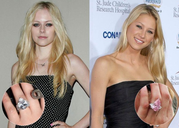 不同於艾薇儿(Avril Lavigne),虽然Anna Kournikova 的婚戒选择了带有粉晶感的透明粉色主钻石,但两人婚戒的造型则都是带有几何元素的不规则设计。