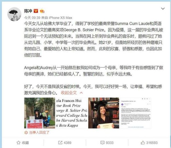 5月29日,陈冲更新微博,和大家分享了大女儿Angela从哈佛大学毕业的好消息,更附上了女儿的毕业服照片,以及女儿获奖的截图和邮件。大女儿Angela从哈佛大学毕业,得到了学校的最高荣誉Summa Cum Laude和英语系毕业论文的最高奖项George B. Sohier Prize。这个奖项十分难得和珍贵,令陈冲作为母亲为女儿感到非常激动。