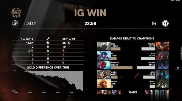 先来看下小组赛中IG的具体表现。第一局IG对阵LGD二队,对线期IG中野疯狂抓中,Rookie还完成单杀,同时上下路也都是对线大优势,前期IG经济领先4K。中期LGD.Y中单单杀Rookie两次,不过IG还是优势太大,21分钟就拿下第一条大龙,最终仅用23分钟,IG通过疯狂打架和乱战拿下胜利。当然这一局的对手是LDL战队,打不赢才离谱,所以并没有太大的说服力。