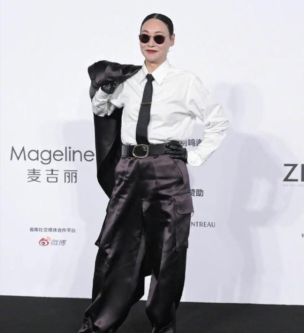 惠英红呢,她选择了简约的白衬衫配西裤,简单又大气,就像她的为人一样,干练洒脱,和她的气质特别搭。