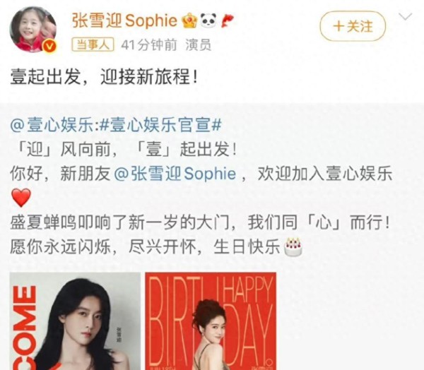 张雪迎官宣加盟壹心娱乐,对方给出的见面礼太诱人了吧!张雪迎加入壹心娱乐,演艺新程开启!