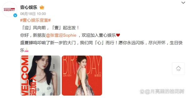 6月18日10:00,壹心娱乐官宣发文:「迎」风向前,「壹」起出发!你好,新朋友张雪迎,欢迎加入壹心娱乐!火红的字幕海报祝福张雪迎生日快乐,愿你永远闪耀!随后,张雪迎发文回应:“壹”起出发,迎接新旅程!