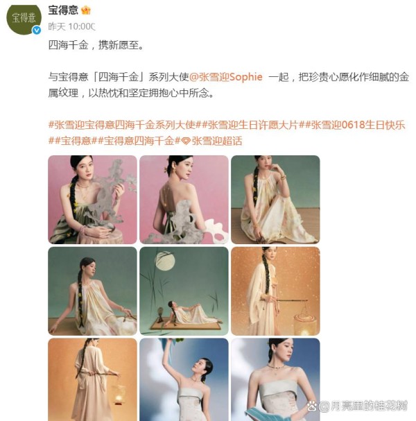 同一天,宝得意官宣「四海千金」系列大使张雪迎,四海千金,携新愿至。9张宣传海报,宛如自画中走来,与宝得意一起,把珍贵心愿化作细腻的金属纹理,以热忱和坚定拥抱心中所念。参演的新电影悬疑片《酱园弄》首映中,有些期待。