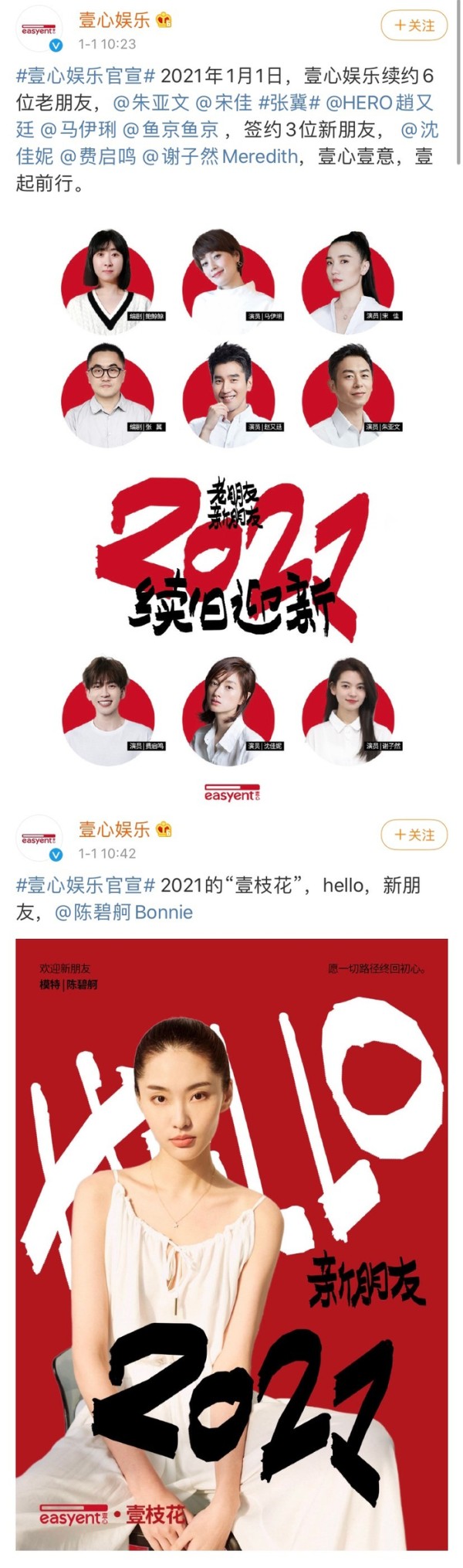 2021第一天壹心娱乐就连续官宣了10位签约艺人……