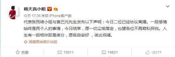 代表张雨绮小姐与袁巴元先生发布以下声明:今日二位已经协议离婚。一段感情始终是两个人的事情,今日结束,愿一切尘埃落定,也望各位不再窥私探究。人生有一段相伴即是缘分,愿各自安好 ,彼此祝福。