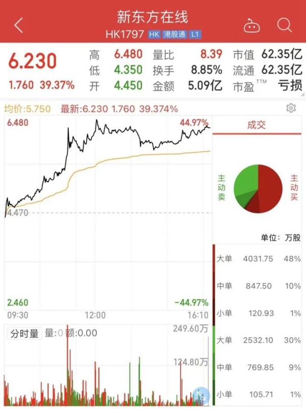 3天时间,粉丝增加近160万,销售额增加1777万元,虽然数据上涨速度远不如刘畊宏来得刺激(一周涨粉2686万),但凭借另辟蹊径的“双语带货”,短时间内,新东方旗下东方甄选直播间在网上制造了刷屏效应。爆炸式增长的直播间观看量以及涨粉速度,也刺激着新东方在线的股价飙升,6月10日盘中一度涨近40%。