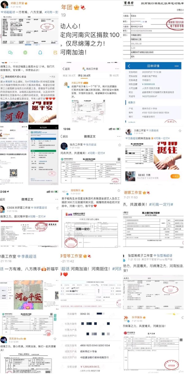 不仅如此,河南周边的几个省份也纷纷伸出援手,调派了多名消防员和设施前往了河南帮忙救灾,广大社会人士和企业也纷纷捐款奉献爱心,而光鲜亮丽的娱乐圈也忙活着,邓超孙俪、时代少年团、黄晓明、范冰冰、肖战、谭松韵、岳云鹏、万茜、宋妍霏、张杰、谢娜、黄子韬、李晨、李雪琴、张哲瀚、李易峰、张雨绮、李若彤、孟美岐、汪苏泷、宋茜、邓伦等诸多艺人也纷纷捐款,奉献爱心。