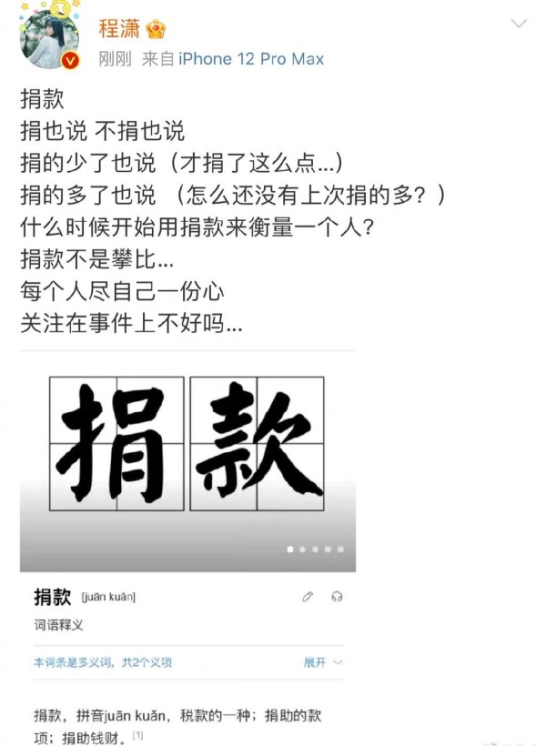 但是,同样作为年轻艺人的程潇却在此次捐款的时候成为了焦点存在,一开始她通过微博发文:捐也说,不捐也说,捐得少了也说,捐的多了也说,什么时候开始用捐款来衡量一个人?随后,又再次秒删,但还是被手快的网友直接截图了。据悉,此次程潇在这次雨灾中,捐款了10万,尽管说跟其他明星对比,的确有些少,但这并不能进行比较。