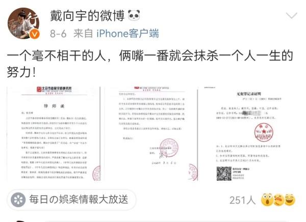 眼看事态愈发严重,为了尽快平息舆论,戴向宇最终选择公开警方开具的无犯罪记录证明,用无可辩驳的事实,证明了自己的清白,还自己一个清白。