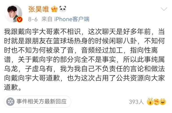 而身处舆论中心的张昊唯,也第一时间发声澄清,表示自己与戴向宇素不相识,之前的聊天内容只是朋友间的玩笑话,被人断章取义、恶意传播。为了表达歉意,他还公开向戴向宇道歉,希望能够得到对方的谅解。