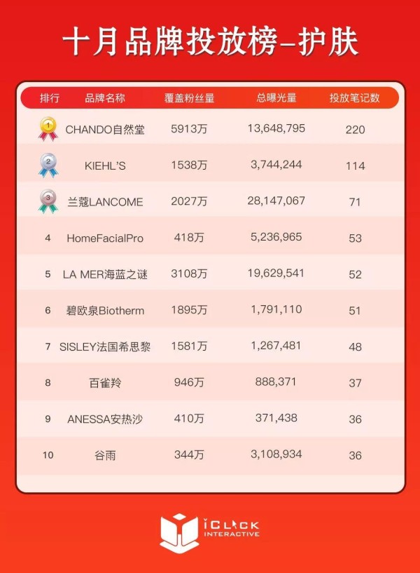 10月护肤行业榜单品牌笔记投放数量前三位分别是CHANDO自然堂、KIEHL'S、兰蔻LANCOME,可以看到KIEHL'S品牌已连续三个月进入该榜单前三位,投放笔记数量非常可观,此外CHANDO自然堂品牌本月投放笔记数量超过200篇。