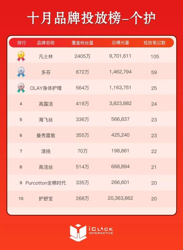 此次榜单发布,爱点击创新院将从粉丝量、曝光量、互动量等维度出发,对10月各垂直领域品牌传播声量及达人活跃情况做一次集中展示。