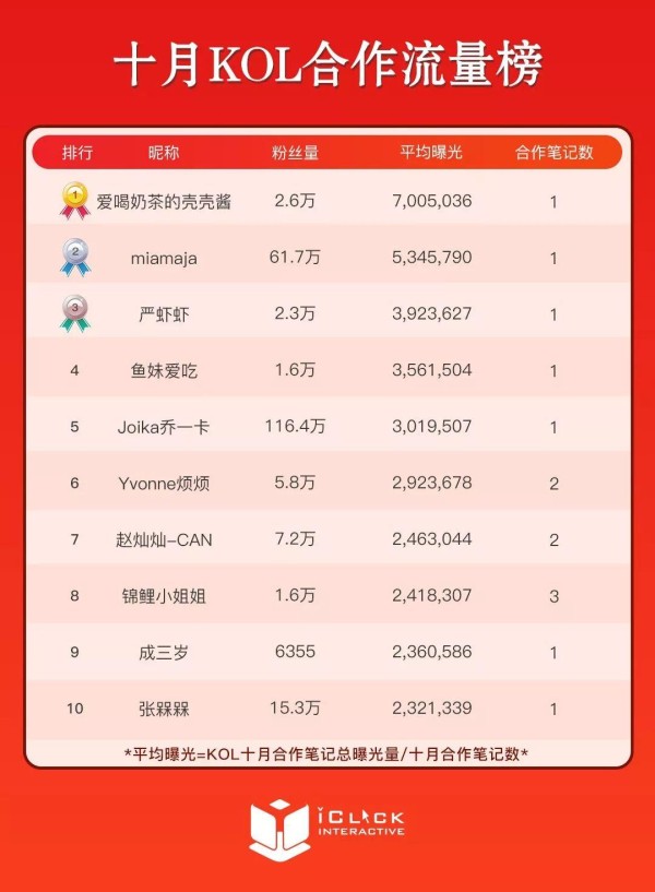 10月KOL合作流量榜的前三位分别是:爱喝奶茶的壳壳酱、miamaja、严虾虾(均为昵称),前两位达人平均曝光超过500万。
