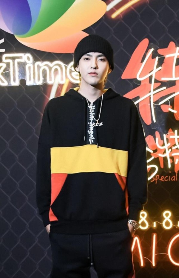 吴亦凡在色彩搭配上,总是让人觉得很舒服。这件主要以中性、饱和度低的冷色调为主的拼接上红黄色块的上衣,时尚感十足。与日系穿搭相似,裤子和帽子都十分休闲、随意。金属质感的手表也为整套穿搭加分不少。