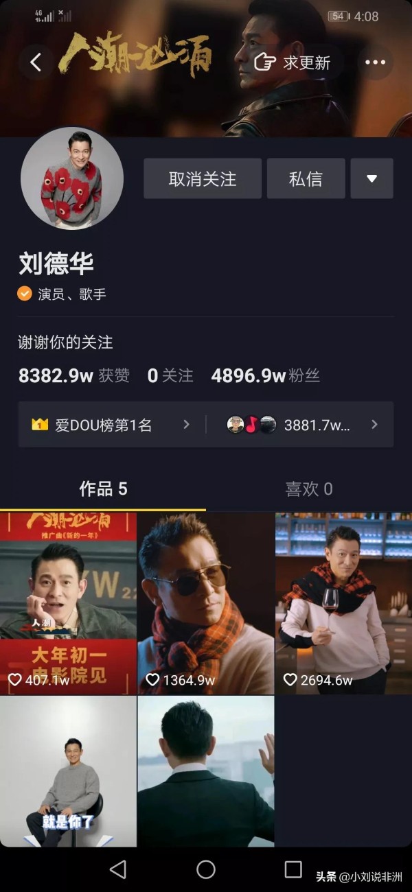 59岁刘德华入驻抖音,粉丝疯狂飙升到4894.3万,点赞8366.1万以上,五个视频就让刘德华有了这么多的粉丝。可见刘德华在娱乐圈才是顶流中的顶流。