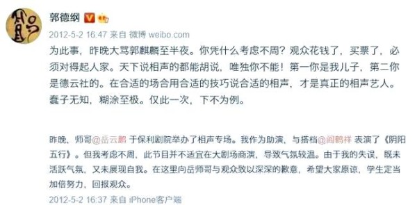 父亲以严厉但富爱心的方式教育郭麒麟,培养其独立性与责任感。面对郭麒麟的嚎啕大哭,郭德纲并未表现出溺爱,而是冷静地引导儿子坐在一旁的台阶上,并严肃地告诉儿子“别搅和别人吃饭”。这种教育方式不仅体现在日常生活中的小事上,更贯穿于郭麒麟成长的每一个阶段,无论大小事务,都始终如一地坚持着严苛的教育原则。无论是餐桌礼仪还是不良习惯,郭德纲都采取严厉措施,要求郭麒麟必须改正。