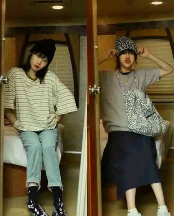 即便是基础的T恤,哪怕版型宽松,也能散发出独特的魅力和风格。例如,一件宽松的灰色T恤与黑色T恤的叠穿,不仅增加了层次感,还与黑色半身裙形成了视觉上的呼应。这样的搭配方式,既保持了清爽舒适的特点,又自然地流露出一种高级美感。