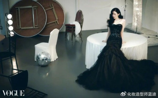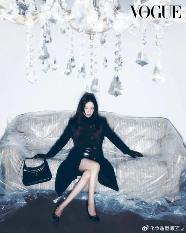 黑丝绒礼服是戏剧的沉淀:丝绒的沉裹着她的柔,她坐在沙发上,手搭在膝头,眼神垂落,把 “角色的张力” 穿在了身上,像从《鱿鱼游戏 2》里走出来的角色,自带故事感。