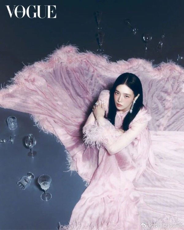 粉色羽毛披风是浪漫的反差:羽毛的软裹着她的酷,她靠在沙发上,手搭在头上,把 “少女的甜” 藏在了细节里,不刻意扮嫩,却自带浪漫感。