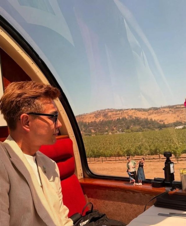 前两天我看到他在朋友圈发了个照片,居然坐上了纳帕谷的葡萄酒列车