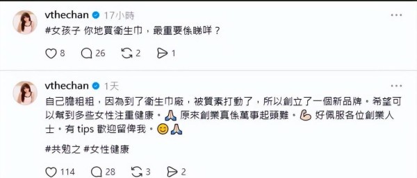 陈思圻没有选择过上富裕家庭太太的悠然生活,而是大胆跨界,涉足商界,静悄悄地转变为一位女性健康用品的企业家。这次,她打造的并非奢华美容品牌,而是极其贴近生活的卫生巾产品。