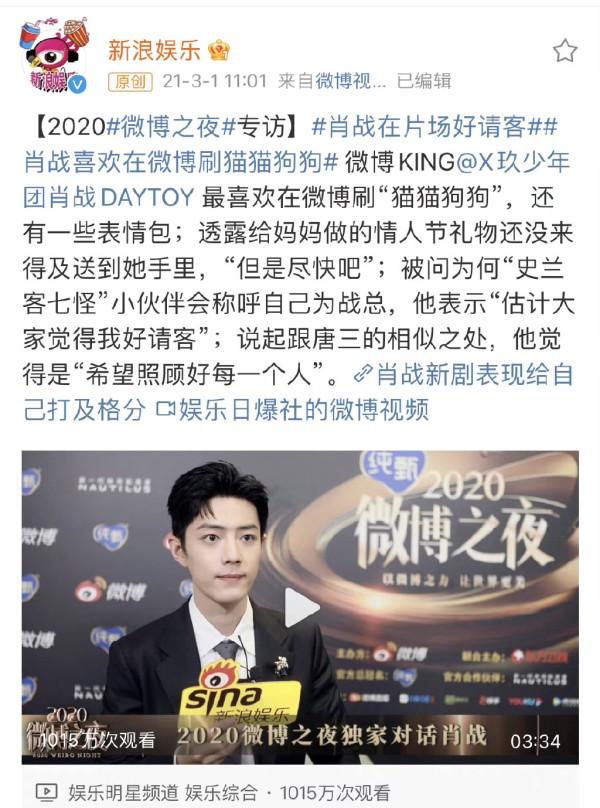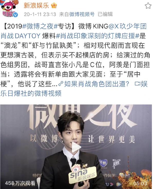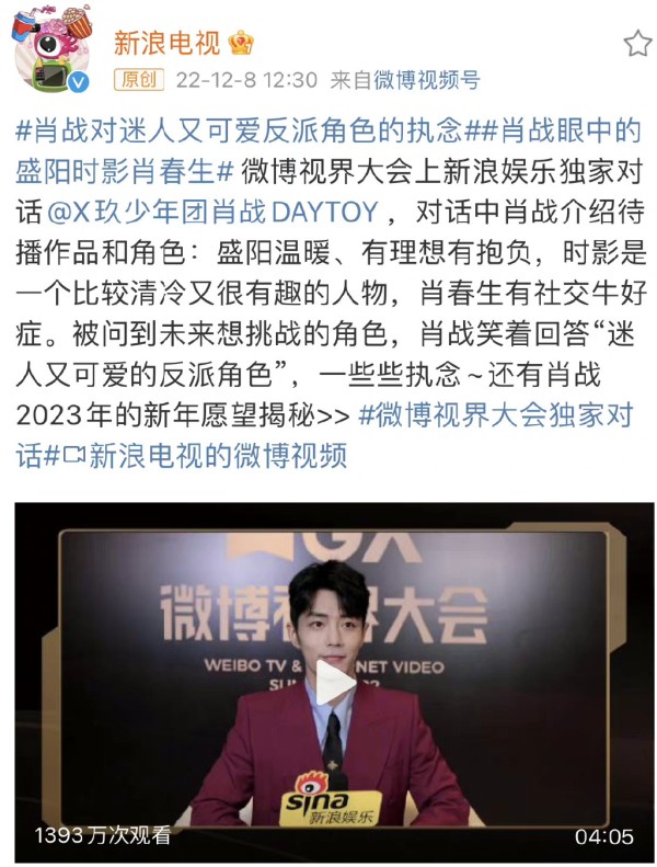 娱乐圈拿艺人绯闻说事,目的不外乎打压艺人人气,影响艺人形象,借机自己上位,上资源。但即便如此也没挡住肖战如潮的人气。比如说肖战每次参加WB之夜后,官方都会发布采访视频,肖战2019年播放量是458万,2020年是1015万,而2022年到目前为止达到了1393万,可见人气热度与日俱增。这真是:黑子年年拿肖战绯闻说事,肖战却年年涨人气,你说气人不气人。