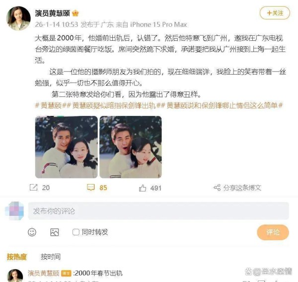 黄慧颐晒与保剑锋旧照,曝男方曾向她求婚,婚前还曾出轨,近20年沉默后首次发声