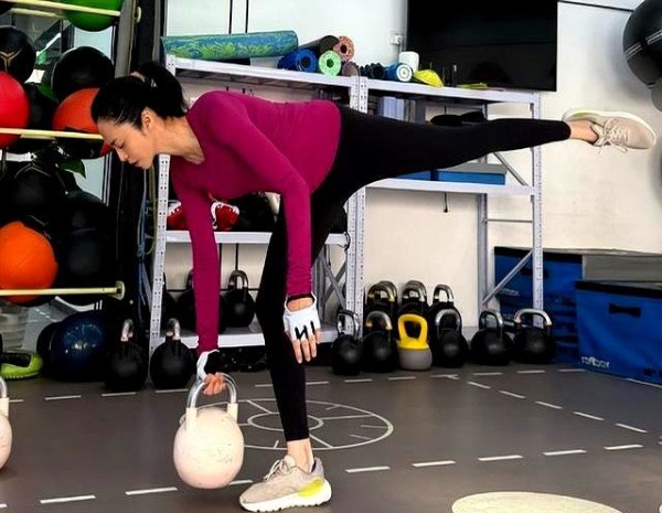 照片本身不复杂,就是女明星常规的营业套餐:紧身瑜伽服、汗水、器械、还有一个专业到有点抢戏的男私教。