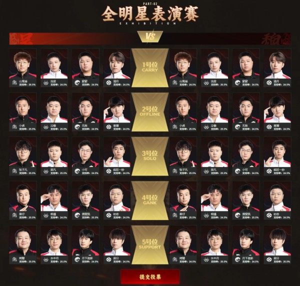 全明星阵容投票通道现已全面开启,4支队伍20名选手,只有10位选手可以从全民投票中脱颖而出。