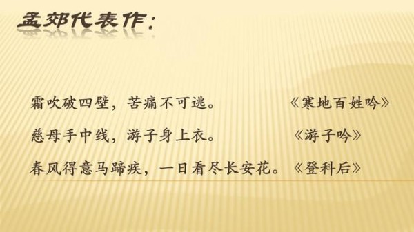 历史人物模板:孟郊从小生性孤僻,家中清贫,因性格狷介以至于官场抑郁失志。其诗作多寒苦之音,感伤自身遭遇,一生穷困,一生苦吟,且用字造句力避平庸浅率,追求瘦硬,故有“诗囚”之称。