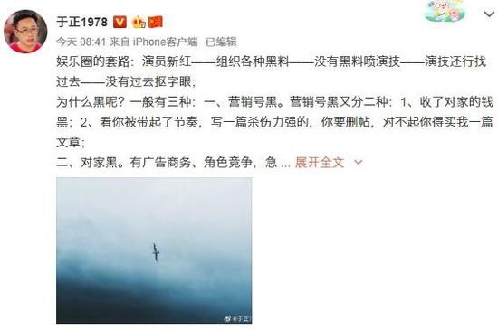 1905电影网讯 9月18上午,于正在微博发布长文“揭露”自己总结的“娱乐圈套路”。针对“新红演员”经常被“黑”的现象,于正总结出几大套路:“演员新红——组织各种黑料——没有黑料喷演技——演技还行找过去——没有过去抠字眼。”