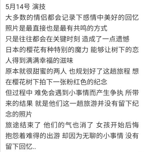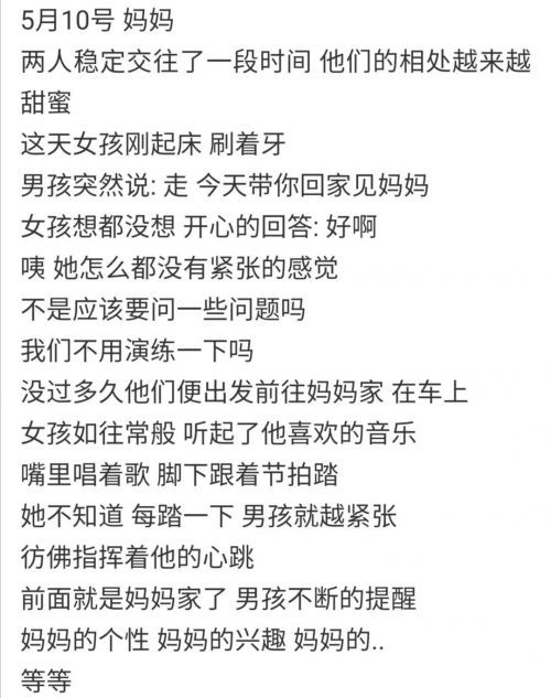 首先,回顾一下罗志祥微博长文的主要内容:5月1号 罗志祥与周扬青因朋友介绍相遇;5月2号 两人因一起合唱差不多先生而相识;5月3号 一起玩酒桌游戏,罗志祥要到周扬青电话;5月4号 罗志祥以之前的酒桌游戏为话题联系周扬青;5月5号 周扬青因为姐妹淘和罗志祥有相同的项链而吃醋;5月6号 两人的初次约会有点尴尬;5月7号 两人针对初次约会的尴尬做起了检讨会;5月8号 两人开始正式交往,分离前罗志祥送周扬青自己同款项链;5月9号 罗志祥借摩托车带周扬青兜风,两人还一起去吃凉面;5月10号 罗志祥带周扬青回家见家长,周扬青与罗妈相处融洽;5月11号 罗志祥取消工作飞回去陪女孩;5月12号 罗志祥回忆和周扬青完成她生命中第一次也是唯一一次的云霄飞车;5月13号 回应当初建议周扬青尝试自己的服装品牌设计;5月14号 两人在日本因为争吵没有留下照片感到遗憾;5月15号 回忆周扬青帮自己化妆,一切都是她早有预谋;5月16号 罗志祥偷偷去东京给周扬青惊喜;5月17号 两人外滩逛街,男孩买玫瑰送给女孩;5月18号 女孩向男孩妈妈讨教 第一次给男孩亲手做料理;5月19号 记录她的生活点滴,两人最大的乐趣就是互相夸奖;5月20号 男孩再次道歉,实现女孩的愿望,在微博发两人合照。