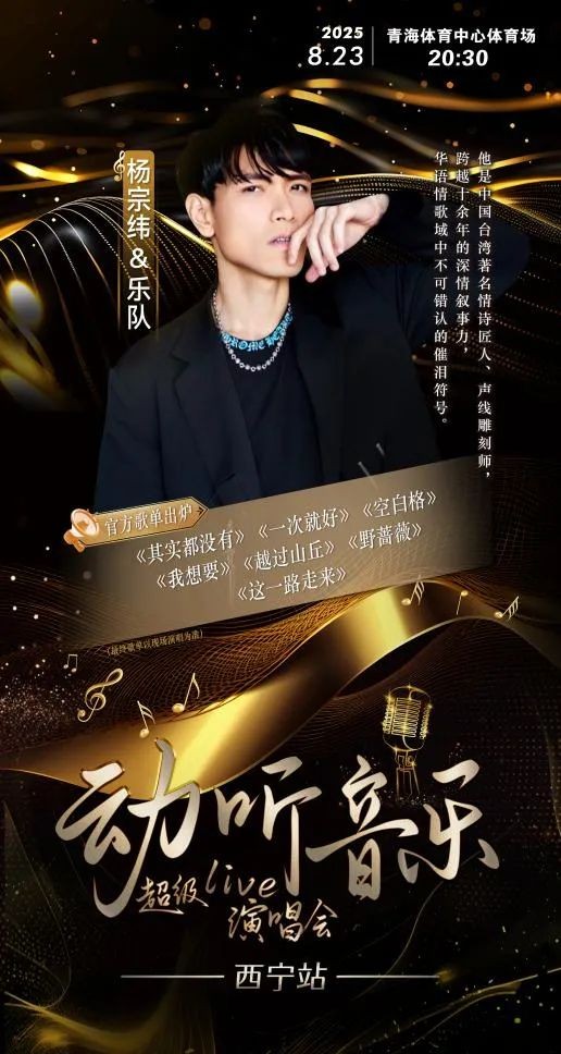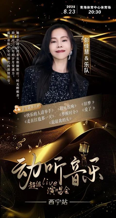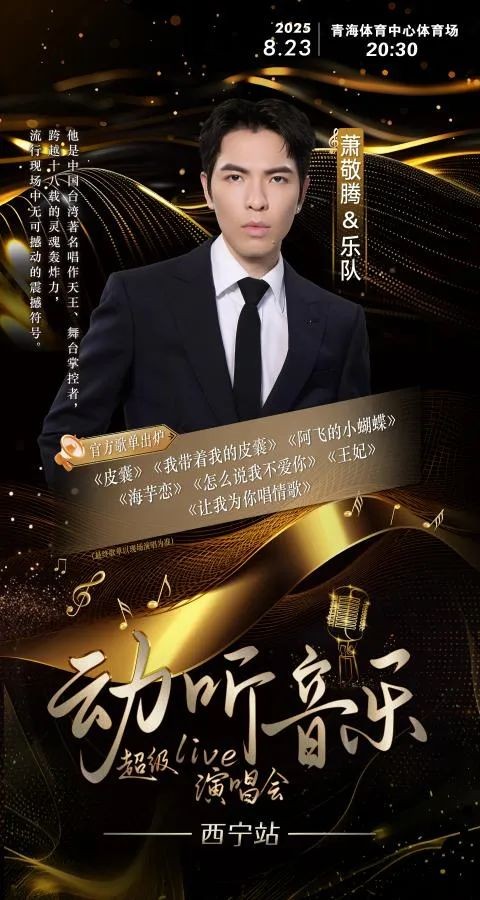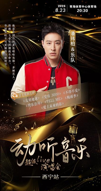 2025年8月23日在青海体育中心体育场将重磅推出“动听音乐超级Live演唱会”。潘玮柏、萧敬腾、杨宗纬、彭佳慧四大实力唱将联袂登场,每位艺人40分钟连唱,配合国际顶级舞美灯光,为市民及游客献一场震撼心灵的音乐视觉盛宴!