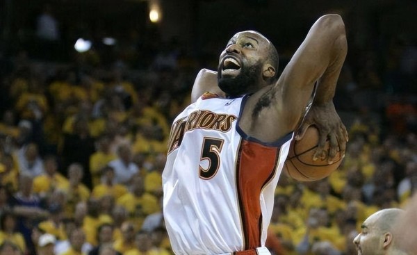 后来,他决定加盟勇士队。那时候的勇士队成绩并不突出,但在老尼尔森的战术体系里,他打得如鱼得水。2006-2007赛季,他场均砍下20.1分、4.4个篮板、8.1次助攻和2.1次抢断,带领勇士队冲到了西部第八的位置。更让人意外的是,他带领勇士队战胜了那个赛季67胜15负、排名全联盟第一的小牛队,上演了黑八奇迹。西部半决赛对阵爵士队时,他还在安德烈·基里连科——人称“AK47”的防守下完成了一记震撼全场的隔扣,这一幕至今仍是勇士队的经典瞬间。