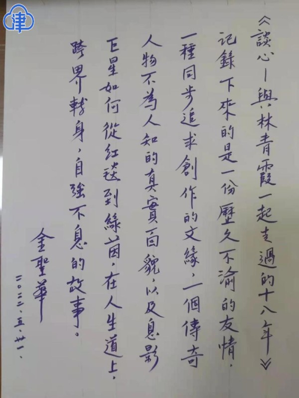 作家白先勇也为该书作序推荐:“金圣华与林青霞相交来往十八年,绝对是一段善缘。她们交往的一段故事,就像一部温馨的文艺片,细细的透着一股暖意芬芳。”(天津日报记者 仇宇浩)