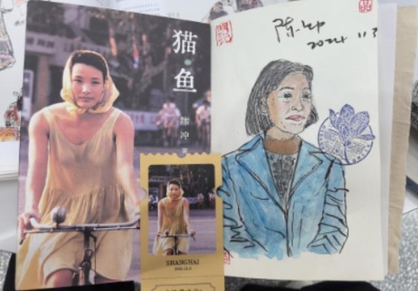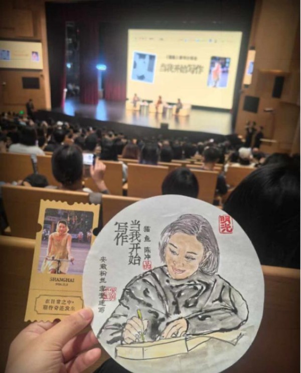 李奎,这位上海某医院的普通医务工作者,也是一位资深书迷。他怀揣着自己精心创作的几幅速写作品,在队伍中格外引人注目。他的作品中有陈冲的人物速写,线条简洁流畅,却生动地捕捉到了陈冲的神韵;还有一只慵懒的 “肥猫” 和一条躺平的 “咸鱼”,这两幅画看似简单,却蕴含着他对生活的独特理解。当他终于走到陈冲面前时,紧张而又兴奋地将人物速写送给了陈冲,并向她解释了自己创作的初衷。他说,自己平时喜欢撸猫,那胖胖的肥猫就像忙碌生活中的一抹慰藉,下班后蜷缩在沙发上,仿佛能忘却一切疲惫。而 “咸鱼” 则是对自己的一种警醒,虽然人生不能总是躺平,但偶尔也要给自己留出放松的时间,比如像今天这样,来参加喜欢的作家的分享会,读一本好书,让心灵得到滋养。陈冲被他的真诚所打动,微笑着在书的扉页上签下了自己的名字,这个签名,不仅是对李奎的感谢,更是对每一位热爱阅读、热爱生活的读者的回应。