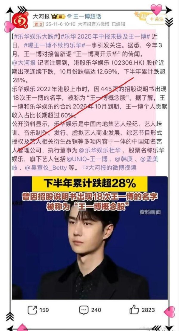 受王一博不续约传闻影响,乐华股价大跌,粉丝开心,杜华成荒谬姐