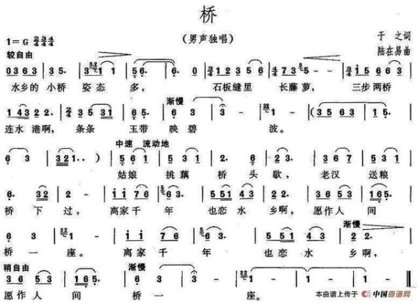 《桥》创作1981年11月,除了曾获第一届中国音乐金钟奖以外,还荣获第十届“上海之春”优秀作品奖,于之作词,陆在易作曲。因为艺术歌曲的艺术特征的显著标志之一即是要求音乐与歌词完美的融合,所以在通常情况下往往选用著名诗人的诗作(例如舒伯特的艺术歌曲创作中常选用歌德、海涅等诗人的诗作为歌词),因而艺术歌曲的歌词显现出的人文情怀就区别于民歌中通俗性审美气质。陆在易在歌词的选择上既不仅注重歌词的音乐性和人文精神,同时通过作品体现出的“乡愁”之情为线索,很好的平衡了大众的审美诉求与艺术歌曲特性间的差异性理由。 歌词以“水乡的小桥姿态多”拉开了歌曲的序幕,缓缓地展开了水乡的秀美的风景画卷。“石板缝里长藤萝,三步两桥连水港,条条玉带映碧波”,紧接着细细地勾勒出水乡如诗如画的生活风貌。整段以安静的姿态以水的背景为承载,描绘了江南水乡的柔美生活场景。第二部分相比较第一部分的安静与柔美,显得活泼了很多,水乡的背景中多了一抹人的颜色,“姑娘挑藕桥上歇,老汉送粮桥下过”,在纯朴的民风中揭示了整首作品体现的“离家千年也恋水乡啊,愿作人间桥一座”的乡愁表象,继而深化至更为深刻的爱家乡、爱祖国的情感中。寥寥几笔的歌词通俗易懂,却激起人们对水乡生活的热爱与憧憬,不仅赋予作品诗样的生活情怀,而且赋予了作品巨大的想象空间。在音乐与文学之间,围绕着“水乡桥影“这一象征性的景物为原形,以民族的故有的文化心理为纽带,建立起了一座美丽的虹桥。 旋律是音乐中最重要基本要素之一,是音乐的核心。因此,在完成了对歌词的分析之后,特别是了解了艺术歌曲的歌词所具有的诗歌气质与歌唱性以后,作为旋律所应该具有的歌唱性自然是不言而喻的。《桥》的旋律流畅优美,具有强烈的抒情性和民族性特征。旋律以级进为主要表达形式,结合三度、四度音程的上下行发展,模仿了江南民歌细腻而委婉的音乐风格;作品中大量的使用了倚音,展现了江南民歌特有的韵味以及流畅自然的风格特征;音乐又大多采用五声音阶,符合了长期以来南方音乐的审美习惯;以此作为铺垫,江南水乡的画卷才在舒缓的节奏中徐徐显现。 早年对民间音乐及民间器乐的学习与热爱,为陆在易艺术歌曲旋律的民族化风格的形成产生了深远影响。《桥》的旋律音调在借鉴传统作曲技法的基础上,植根于苏南民歌的沃土中,将二者融会贯通,由此音乐的风格也显现了对大众审美心理的充分尊重。 作品的开始即借鉴了中国传统戏曲、曲艺艺术中的散板节奏,通过散板在节拍时值上的自由灵活的基本特征,承载乐曲一开始悠长的旋律要求,以便于引入水乡小桥的优美意境,直抒情怀。也因为散板节奏独特的节拍特征,这种节拍的使用在现代歌曲创作中,特别是需要直抒胸臆抒情歌曲的创作中经常使用。作品的开始句,由3开始,上四度跳进至6再回到3,这种手法是以借鉴了典型的江南民歌的创作为依据的;第二句中开始使用了大量级进,以此奠定作品借鉴的江南民歌自然而平和的音乐特征。后两句旋律开展,尤其是第三句起伏较大,在第四句上基本实现了第一句江南民歌典型跳进手法的回归。