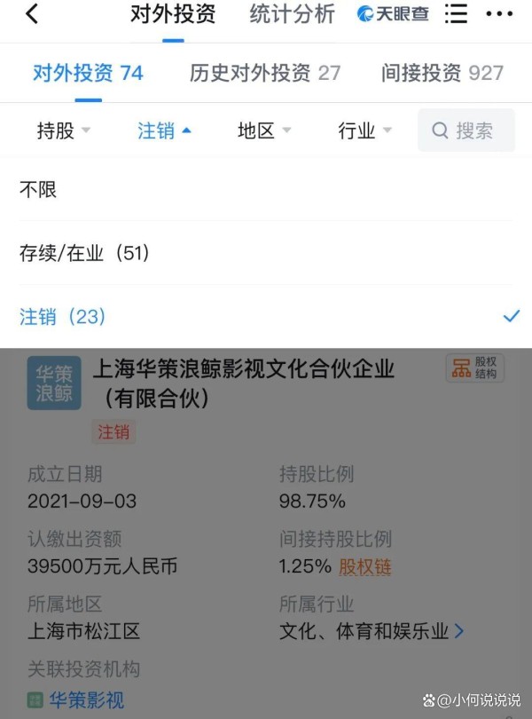 随后,#华策影视旗下20余家企业已注销#话题紧跟着发酵,天眼查信息显示,目前华策对外投资了74家企业,其中51家企业处于存续状态,包括上海华剧汇科技有限公司、上海克顿文化传媒有限公司等,其他23余家企业已经注销,包括上海华策浪鲸影视、华策爱奇艺影视、海南华策新传媒等。