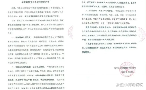 2月25日,华策发布关于不实传闻的声明,否认解散电影部门,并表示未来将对全内容板块进行转型升级,电影板块转型的核心思路之一,是2026年不再盲目追求规模,而是坚守“收支平衡”的底线,优先修复现金流。同时,九派新闻报道,华策影视董秘办表示,未来华策会继续做电影业务,只是会更为谨慎地选择电影项目和题材。