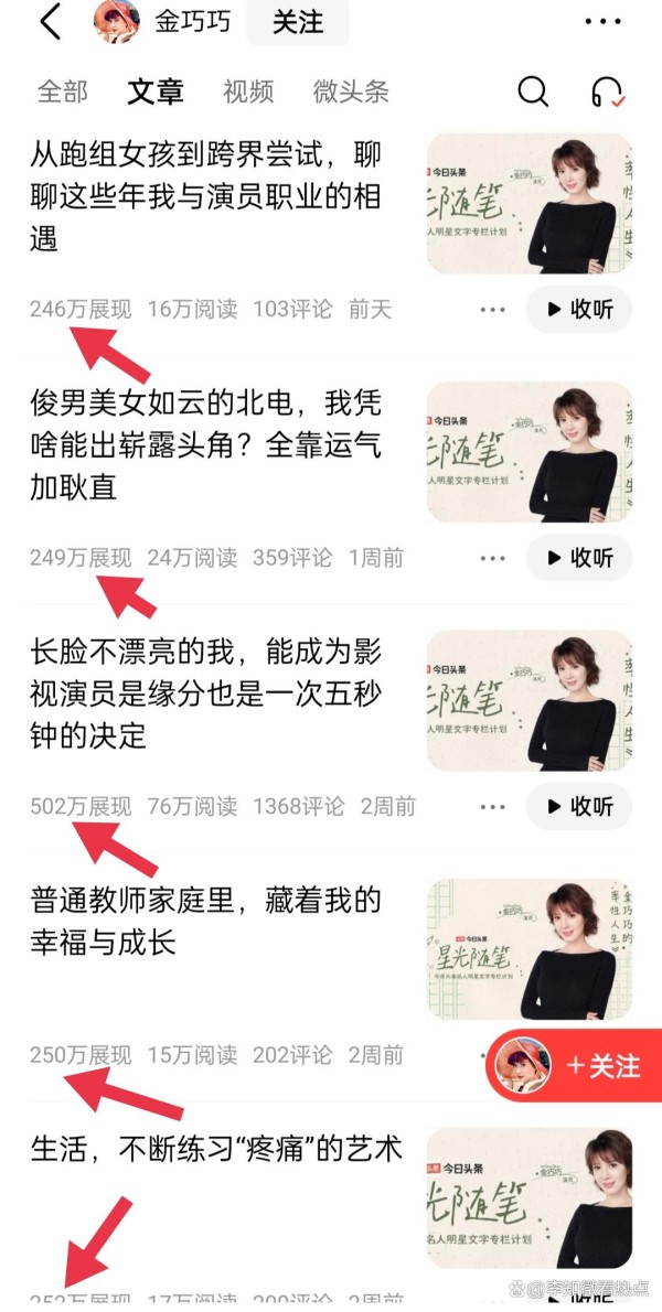 说到这,我必须提提金巧巧在今日头条发的文章。篇篇展现量高得吓人,动不动就是几百万,你觉得这正常吗?收益不低吧,单价应该很高吧!