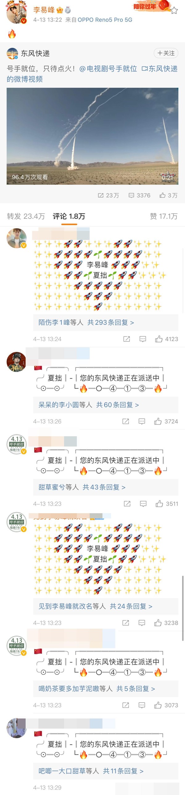 《号手就位》开播,李易峰当天发了微博,点开评论区你就会发现粉丝们真的给足了排面,花式评论全都出来了,甚至还出现了火箭图案的花墙,点开这种评论区,真的让人想不注意都很难吧?而为了宣传这部剧,李易峰的粉丝人手一份宣传的花墙。