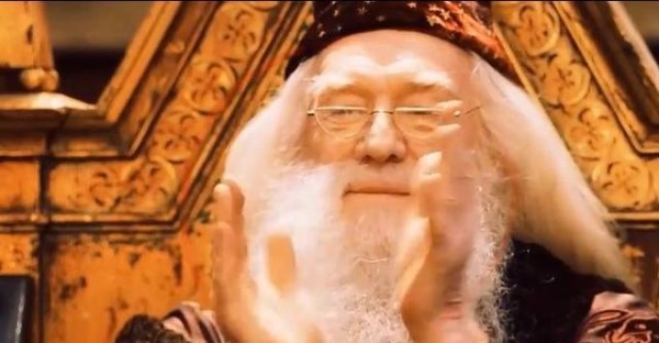 终于,一直很神秘的邓布利多在分院仪式之中露面了。这里有一个小细节,导演通过对邓布利多的鼓掌来暗示他对哈利的注意。