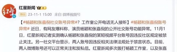 网友曝料:杨颖和张嘉倪的公开社交账号遭禁言或禁止关注!如今,记者查询到了其中一个社交平台,显示两人的账号因违规而被禁言,且有一账号被禁止关注。极目新闻记者在11月1日在另一个社交平台发现,杨颖和张嘉倪的个人认证账号无法点击关注。与此同时,有网友在今天中午称,杨颖和张嘉倪的微博账户也出现了异常情况。然而,截至下午记者查询到的情况是,两人的微博账号仍然可以正常关注和发私信。