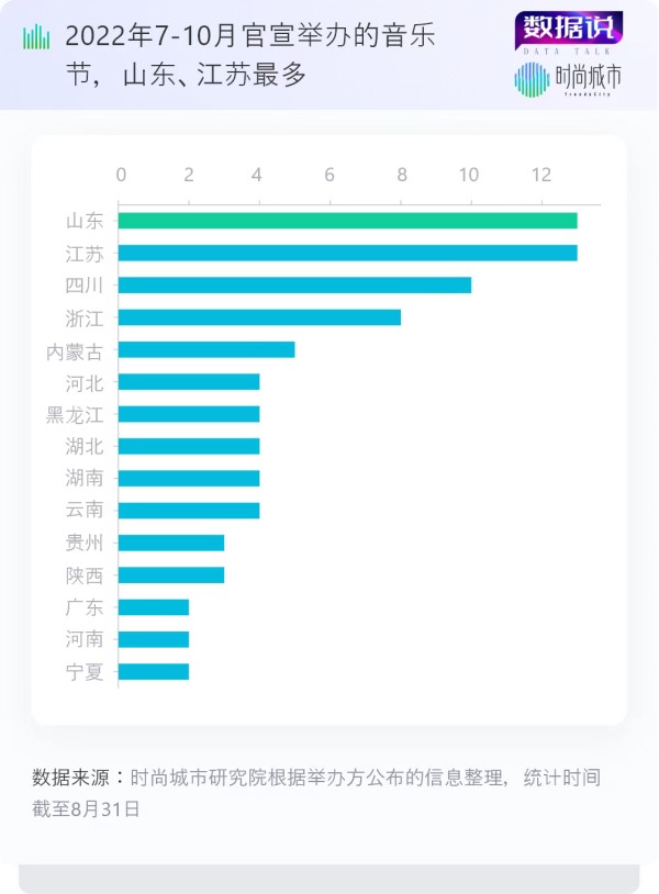 每年7月到10月,是音乐节举办的高峰期,今年,各省市举办音乐节情况,山东、江苏、四川、浙江位列前分别以12场、12场、10场、8场位列前4,内蒙古以5场紧随其后,河北、黑龙江、湖北、湖南分别有4场音乐节。