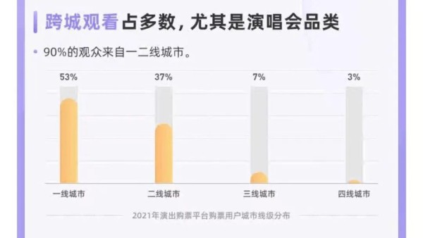 《2021中国演出行业数据洞察报告》显示,2021年中国演出行业贡献票房的主力军,一线消费者占53%,二线消费者占37%,三线城市消费者7%,四线城市消费者占3%。