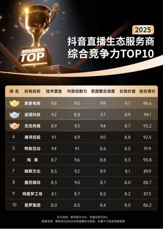 在此背景下,中国电商产业研究院联合蝉妈妈数据发布《2025抖音直播生态服务商价值评估榜单》,以技术壁垒(30%)、内容创新力(25%)、资源整合深度(20%)、长效价值(25%)四大维度重新定义行业领航者。这份榜单不仅是一张排名,更是一幅行业价值重构的导航图。以下为完整榜单: