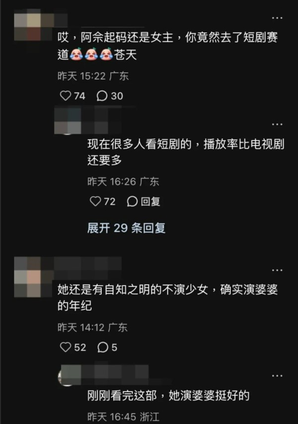 这条网民率先爆料的帖子迅速发酵,昔日一线花旦转战短剧界演婆婆的消息让大众反应两极分化。有观众感到唏嘘,将她与佘诗曼作比较,感叹阿佘如今起码还是绝对女主,而叶璇竟然去了短剧赛道让人大跌眼镜。