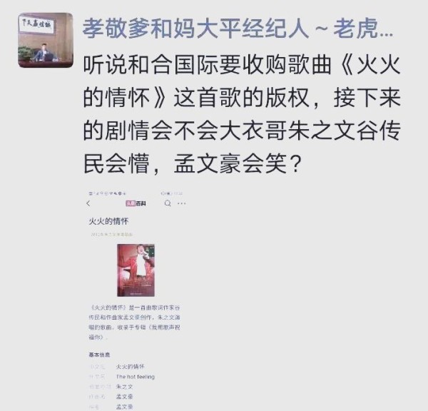 在大衣哥与谷传民的著作权纠纷案件尚未有定论之际,却传出了另一则消息。据称,孟文豪,这位与大衣哥和谷传民有着深厚友谊的人士,近期竟然卷入了《火火的情怀》版权的收购风波。据抖音平台上的知名经纪人老虎透露,广州一家名为和合国际的公司正计划斥巨资收购这首歌曲的版权。
