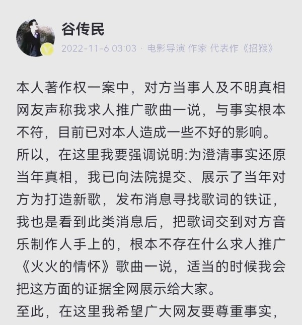 众所周知,大衣哥与谷传民因《火火的情怀》的版权问题对簿公堂。据悉,这首歌曲由知名作家兼编剧谷传民作词,并由著名音乐人孟文豪精心作曲。其深厚的音乐底蕴和文学价值,使得这首歌曲在大衣哥与谷传民的著作权纠纷案件中扮演着举足轻重的角色。